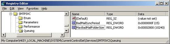 Create a new key called "Queuing". Within this key create a DWORD entry called MaxBadMailFolderSize and specify the maximum size of the Badmail folder in KB (as Decimal). Now create another DWORD entry called BadMailSyncPeriod and specify, in minutes, how long the system should wait before checking the size of the Badmail folder (again, as Decimal). In figure 1 we can see that I have set the BadMailSyncPeriod value to 15 minutes with the MaxBadFolderSize being set to 10MB.
