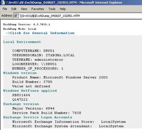 The Exchange Dump Utility report looks like that shown in Figure 2. Simply open the HTM file in Internet Explorer to view it. Here we can see the general computer information being shown.