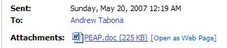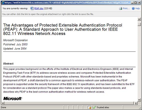 In this example, when I clicked on the "Open as Web Page" link next to the attached word document called PEAP.doc, it opened a new browser window, converted the document and displayed it as an HTML web page, as shown in figure 2.