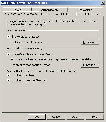 You can also manage the WebReady Document Viewing configuration using the Exchange Management Shell. As an example, the following command will enable WebReady Document Viewing on Public computers but disable it on Private ones: