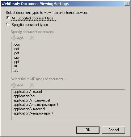 4. Click the "Supported" button to bring up a dialog giving you the option to choose which file types you want to allow - you can let users view Word Documents but not PDF Documents for example. If you want to allow all file types to be viewed from the Internet browser select "All supported document types". Otherwise, enable "Specific document types" and choose which file types you want to allow. Any items in the list will be allowed, so select the one you want to disallow and click the remove button.