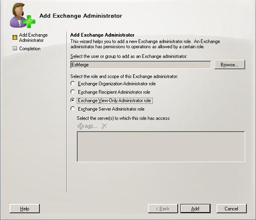 5. Complete the wizard and ExMerge will now be added to the list of administrators.
