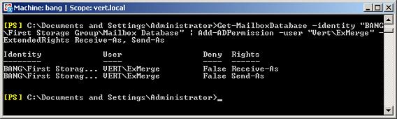Get-MailboxDatabase -identity "BANG\First Storage Group\Mailbox Database" | Add-ADPermission -user "Vert\ExMerge" -ExtendedRights Receive-As, Send-As