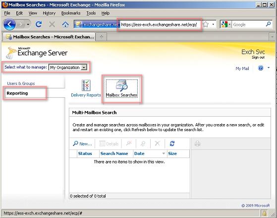 The web based ECP interface, is the easiest way for non-technical users to execute a Multi-Mailbox Search. From his browser a user can open the ECP and click on the Mailbox Searches tab available under Reporting at the navigation pane.