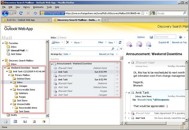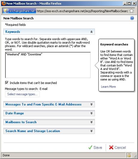Below is an example to search "Weekend" and "Outage" words in email type content of a mailbox "Amit Tank", for the date range starting from 1/1/2009 to 12/31/2009 and includes unsearchable items.