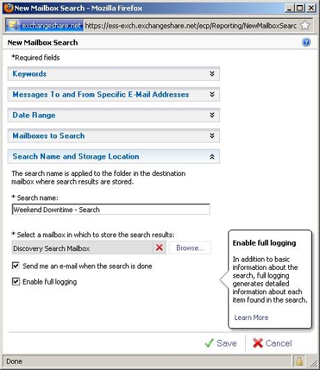 Specify an identifying name to the search and the location to store the search result to. The Wizard here only shows discovery mailboxes for result storage.