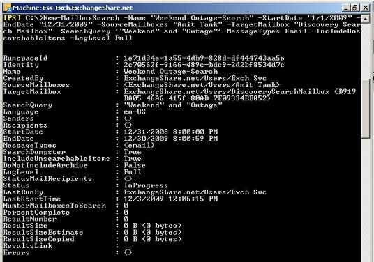New-MailboxSearch -Name "WeekendOutage-Search" -StartDate "1/1/2009" -EndDate "12/31/2009" -SourceMailboxes "Amit Tank" -TargetMailbox "Discovery Search Mailbox" -SearchQuery '"Weekend" and "Outage"' -MessageTypes Email -IncludeUnsearchableItems -LogLevel Full