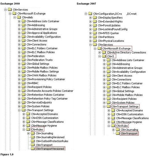 If you have been using Exchange 2007 transport rule disclaimers, and have transitioned to Exchange 2010, disclaimer rules will be converted and stored in an Exchange 2010 Active Directory container. Exchange 2010 creates a new transport rule container in Active Directory, so if you already have an Exchange 2007 disclaimer , you will find that stored in both Active Directory containers. For this to work, any changes made to the disclaimer rule in Exchange 2007 will need to be replicated to the disclaimer rule in Exchange 2010 but the other way around is not supported due to the newly added features that didn't exist in Exchange 2007. Using AdsiEdit we can have a look at the two AD containers, see Figure 1.