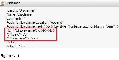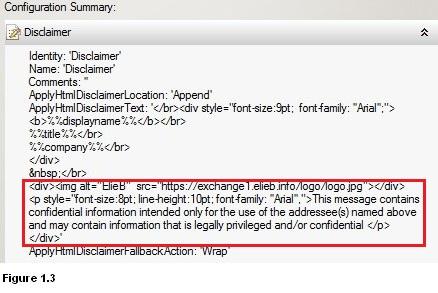 The last step would typically be to add the disclaimer text. In Exchange 2007 we would do this using the disclaimer rule editor. However in Exchange 2010, we will define this using html tags as shown in Figure 1.3