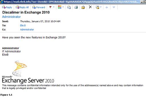 From the users' side, the disclaimer transport rule created in Exchange 2010 would look as shown in Figure 1.4