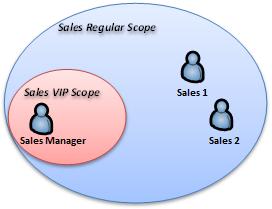 In the Sales OU we have the "Sales Regular Scope" and the exclusive "Sales VIP Scope". Sales Administrators are responsible to perform some task on all users within the Sales OU except for the VIPs. To accomplish this, we create an exclusive scope that includes the VIP users. Now the Sales Manager recipient object cannot be controlled by the commands in the Sales Regular Scope because it is included in the exclusive scope. To allow access and control on the objects within the exclusive scope, a role assignment would have to be created in order to link the scope to a management role.