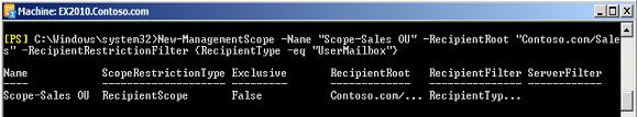 New-ManagementScope -Name "Scope-Sales OU" -RecipientRoot "Contoso/Sales" -RecipientRestrictionFilter {RecipientType -eq "UserMailbox"}