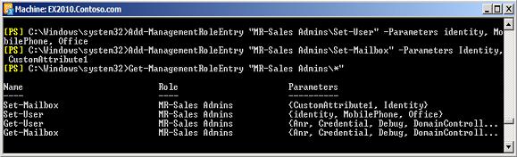 Add-ManagementRoleEntry "MR-Sales Admins\Set-User" -Parameters Identity, MobilePhone, Office