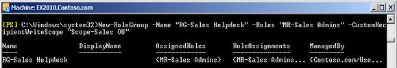 New-RoleGroup -Name "RG-Sales Helpdesk" -Roles "MR-Sales Admins" -CustomRecipientWriteScope "Scope-Sales OU"