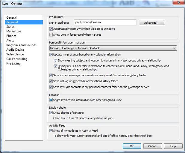 To access the Lync Client settigns, go to the "Options" button and then select "Personal". The following screen will show up:
