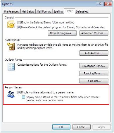 All the Outlook 2010/2007 integration features are enabled by default when you install the Lync client. You can control the settings individually using the Lync client, Outlook client, Office Group Policy objects or through Lync Server 2010 in-band policies. Each alternative provides access to different settings as described below.
