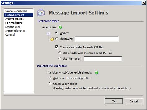 Message Import - Specify how the imported items are to be merged into the destination mailboxes. The basic choice is between creating a separate folder tree under the user mailbox and merging directly the imported items in the current mailbox folder structure.