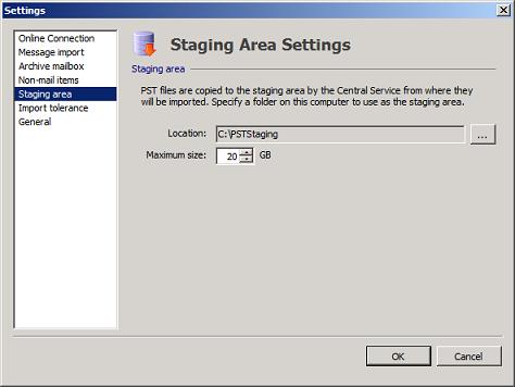 Staging Area - Basically this is the temporary disk location where PSTs are saved until the Central Service completes the import. Keeping an eye on this directory during an import, you will see PST files being created here and deleted automatically.