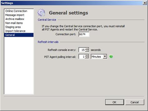 General - Here we have a mix of settings. At the top we have the port number the Central Service listens to. Agents installed on user machines will need to have the same port number, we highlighted this in Installing PST Capture, when discussing the Agent installation.
