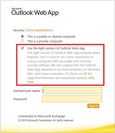 This is what the Exchange 2010 login page looks like. It is immediately clear that OWA Light is being served. Exchange 2007 also returns a similar login page showing the OWA Light checkbox. In Exchange 2013 we have to logon to the mailbox first in order to see which OWA interface is being served.