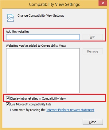 Selecting the 'Display intranet sites in Compatibility View' checkbox solves the problem for internal OWA access. As for external access, we have to add the domain used to publish OWA to the outside world. Enter this at the 'Add this website' field and click Add.