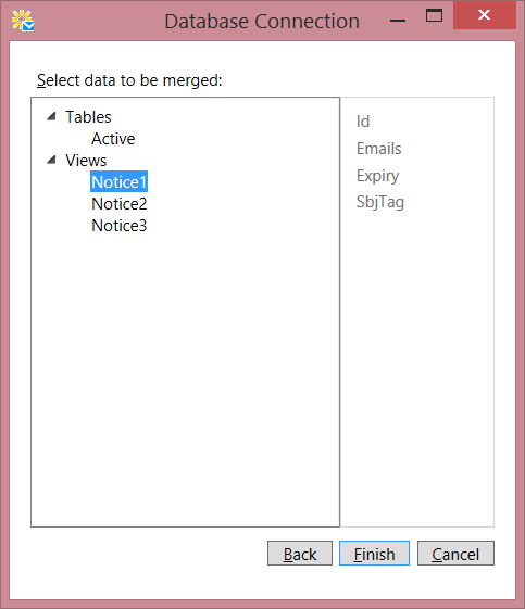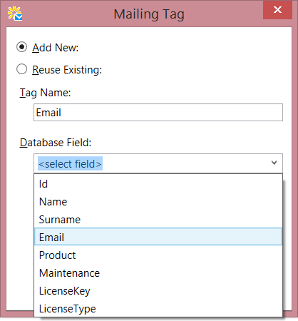 At the Mailing Tag dialog we can create a new tag or reuse an existing one. To create a new tag, enter a unique tag name and select a database field. Here we are creating a mapping between a tag and a database field, telling the mailer from where to retrieve the tag data.