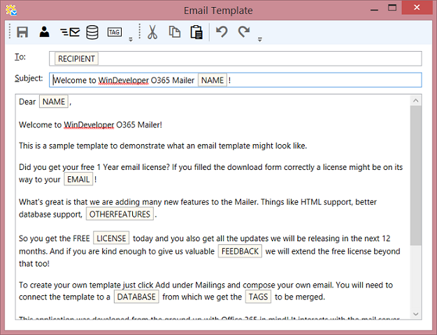 Complete authoring the template by inserting more text and tags as necessary. Don't forget to configure the RECIPIENT tag under the To field. Just click on the tag and set it to point at the database field holding the recipient addresses to whom the emails are to be sent.