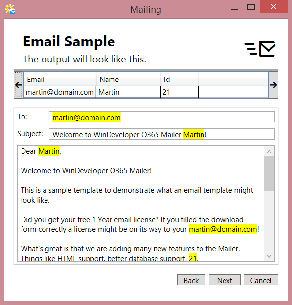 This completes our first mailing. We can now run mailings, freeing ourselves from repetitive error prone tasks. To learn more, check the WinDeveloper O365 Mailer homepage which is being updated regularly with new resources and tutorials.