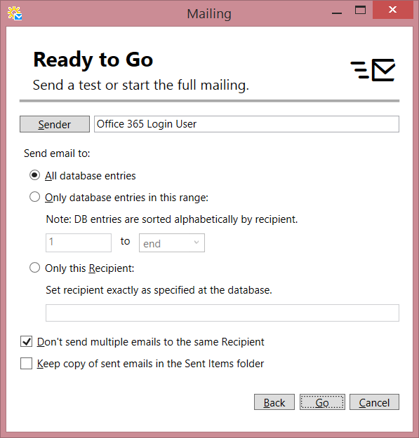 Finally we get to the Ready to Go page, the last step before starting the mailing.