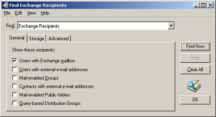 • On the General page set the check-box for 'Users with Exchange mailbox' and clear all other checkboxes.
