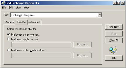 • On the Storage page we select 'Mailboxes on any server'. Alternatively from here we could also choose mailboxes located on a specific server or within a specific store.
