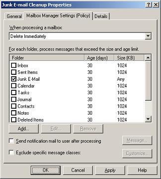 The Exchange Mailbox Manager is the right tool for us to setup automatic Junk E-mail cleanup. A lot of documentation covering the Mailbox Manager (see references) is already available. Thus today I will focus on configuring this specifically for Junk E-mail cleanup.