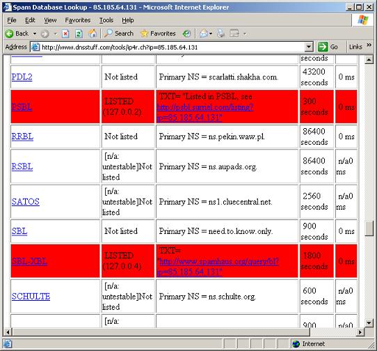 A good starting point for anyone interested in RBLs is the DNSstuff site. Using their Spam Database Lookup tool allows to quickly submit an IP to various RBL providers. Apart for seeing RBLs in action, we may also verify our own servers. Here is an example:
