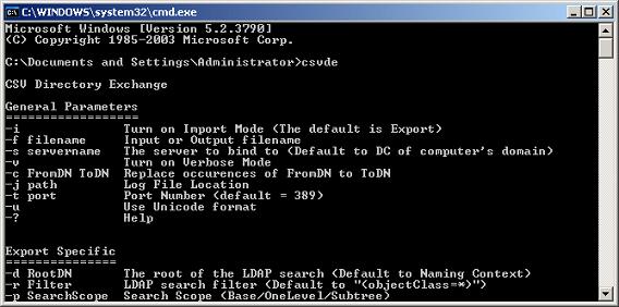 To get to the application help screen run the command without any parameters. Here is how the CSVde.exe help looks like (the one for LDIFde.exe is very similar).