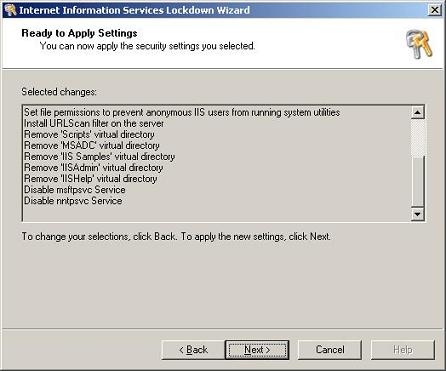 Select the options to be applied and after clicking Next you will be taken to the page summarizing the actions that are about to take place. Go through this list and if you are happy with it, press "Next" for the IIS Lockdown process to begin. Should you wish to make changes, simply press the "Back" button.
