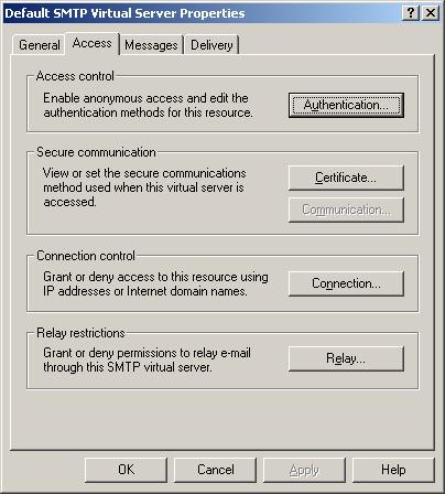 In Exchange 2003 you will find these under the SMTP virtual server properties and SMTP connectors. At the SMTP Virtual server properties, under the Access page, click on Authentication. Here we find the settings for inbound emails.