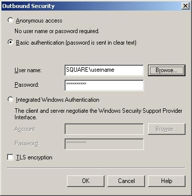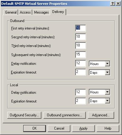 Next check the authentication settings for outbound connections. At the SMTP virtual server under the Delivery page click on the Outbound Security button.