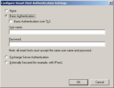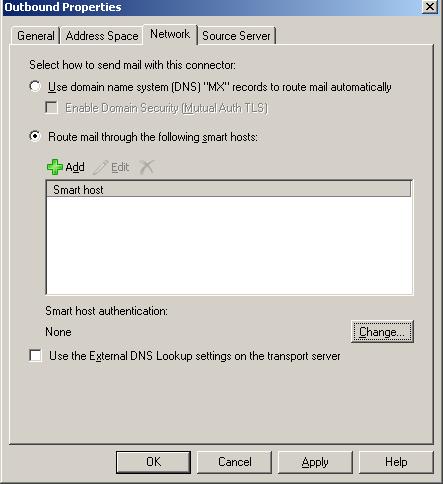 At the Send Connector select the Network property page. Authentication configuration here is directly bound to the smart host configuration. This clarifies the right context when outbound authentication could be configured. Select 'Route mail through the following smart hosts" and click on Change to expose the Authentication settings.
